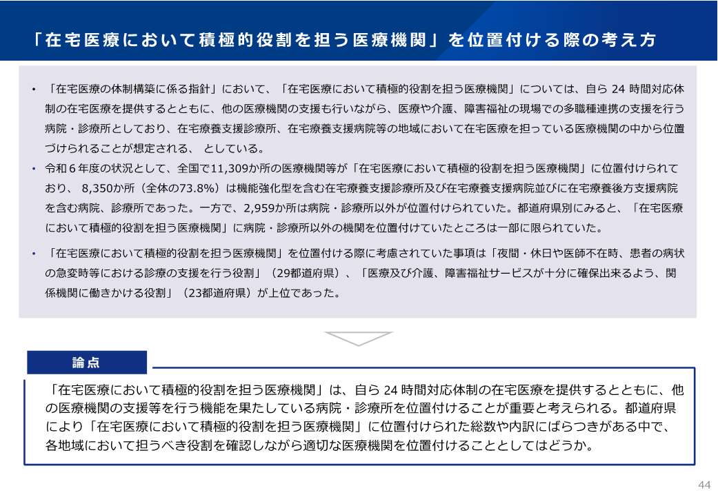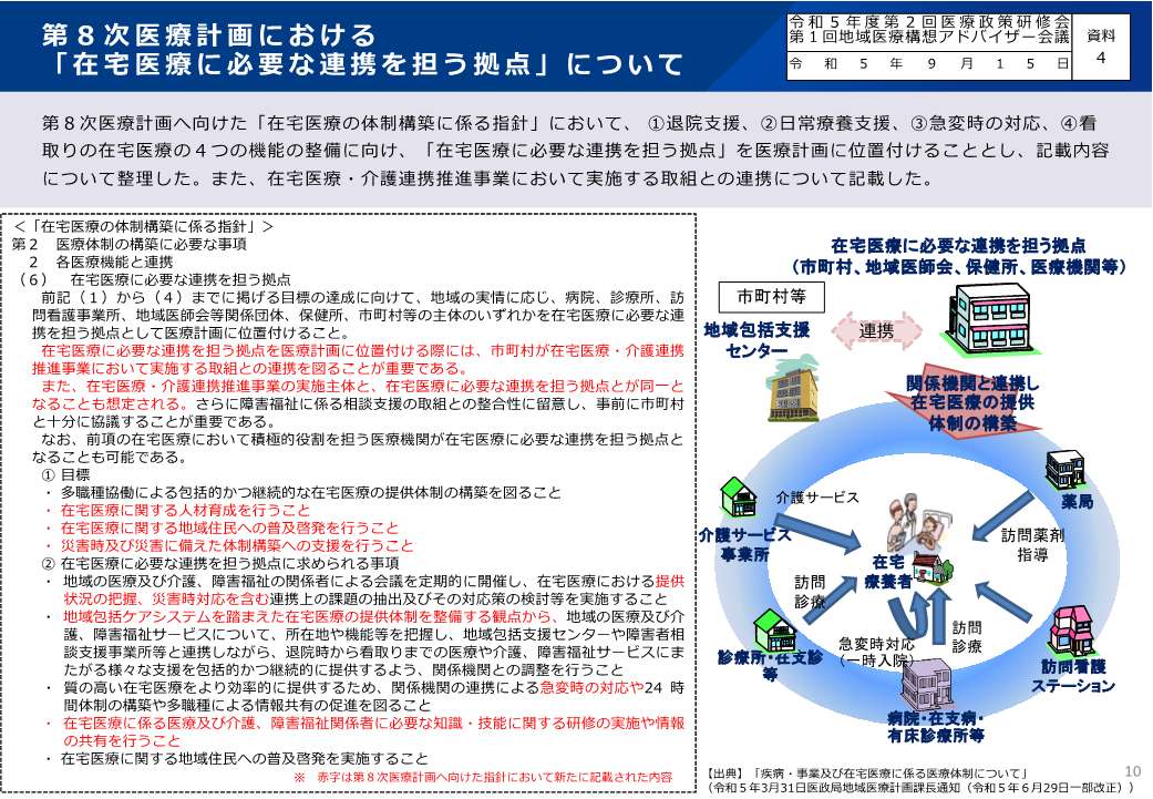 第8次医療計画に位置づけることとされました、「在宅医療において積極的役割を担う医療機関(積極役割機関)」、「在宅医療に必要な連携を担う拠点(連携拠点)」、「在宅医療の圏域」等について、2026年4月より調査・研究し、各圏域にふさわしい医療体制を協議します(積極役割機関を人口10万人あたり1か所、連携拠点を人口20万人あたり1か所を想定)。